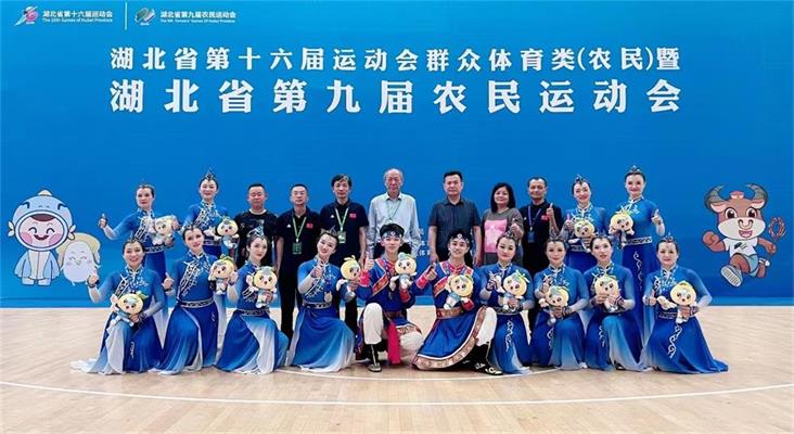 熱烈祝賀謝芳同志(照片中第一排從左到右第三位)在湖北省第十六屆運動會群眾類(農(nóng)民)健身操團體比賽中獲得一枚金牌,四枚銀牌,團體總分第一的優(yōu)異成績。   下圖為湖北省第十六屆運動會代表團辦...